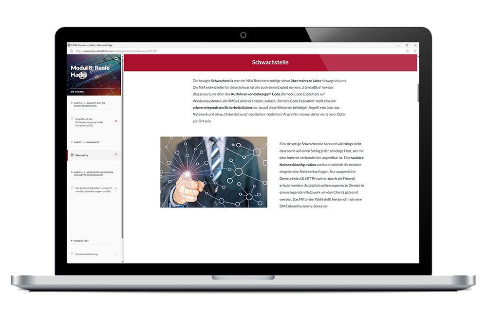 The CYBER SECURITY package teaches the basics of security and network technology as well as different concepts for protecting your own device. In addition, application-based knowledge in the areas of “penetration testing”, “digital forensics” and “defense against a step-by-step cyber attack” is imparted, which is part of the basic knowledge of IT managers.